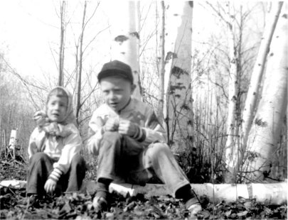 My sister and I, taken at the Otsego Lake building site where my Grandparents Andy and Marie built their new house. This was taken about 1955.